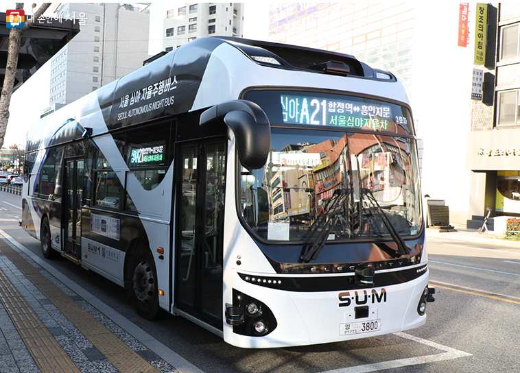 심야 자율주행 버스의 노선번호는 '심야 A21'로 대학가, 대형 쇼핑몰등이 밀집한